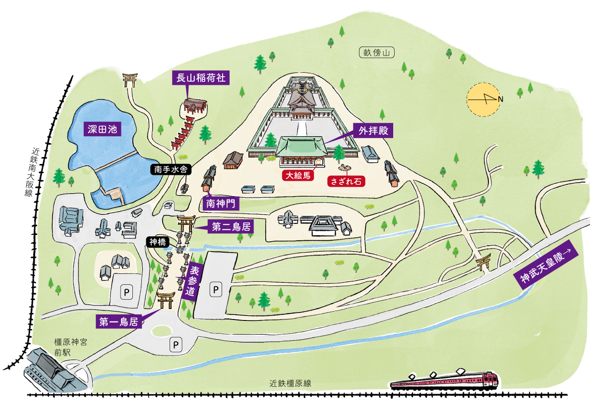 最寄り駅は近鉄「橿原神宮前」駅。第一鳥居までは徒歩約5分です。訪れる場所によっては、「畝傍御陵前」駅や「橿原神宮西口」駅の方が近くなりますので、事前確認をお忘れなく!