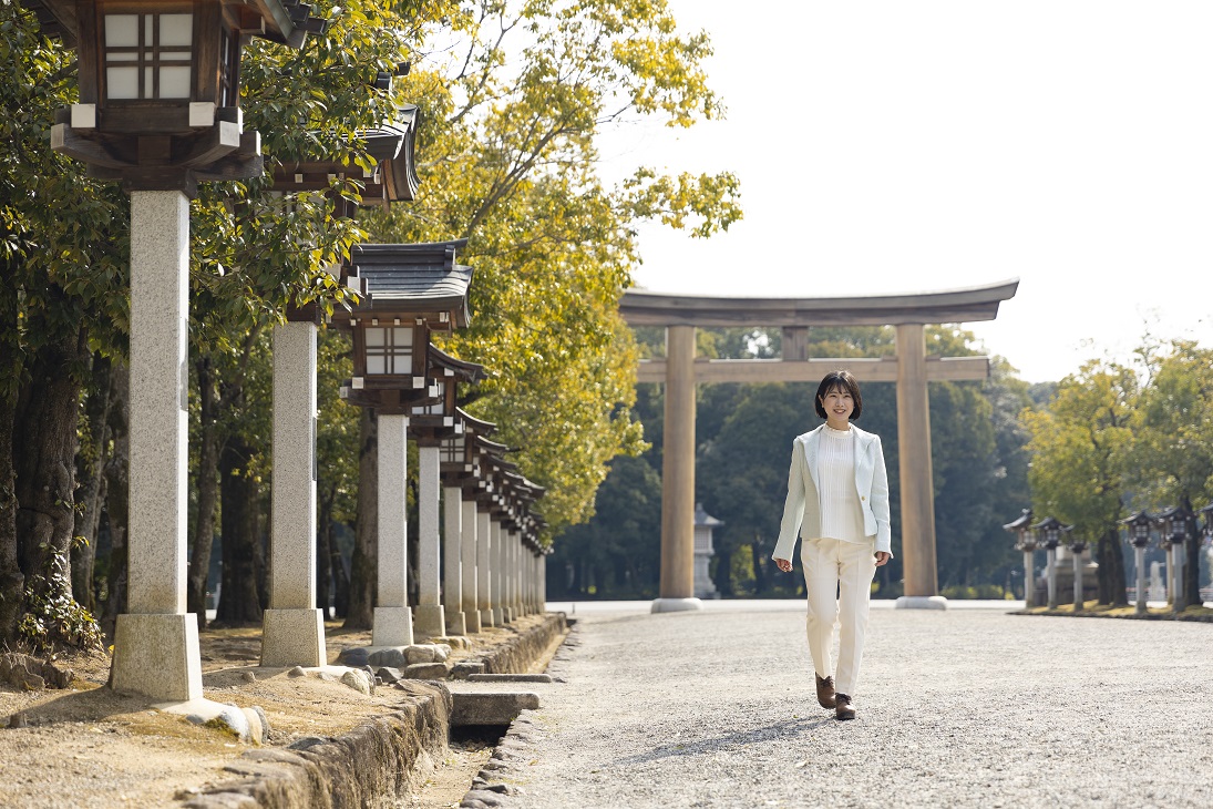 門をくぐれば雄大な畝傍山を背に建つ外拝殿が見えてきます。外拝殿は両脇に長い廻廊を連ねた入り母屋造りの建物。昭和の神社建築の粋が尽くされており、その荘厳な雰囲気に居住まいが正されるようです。