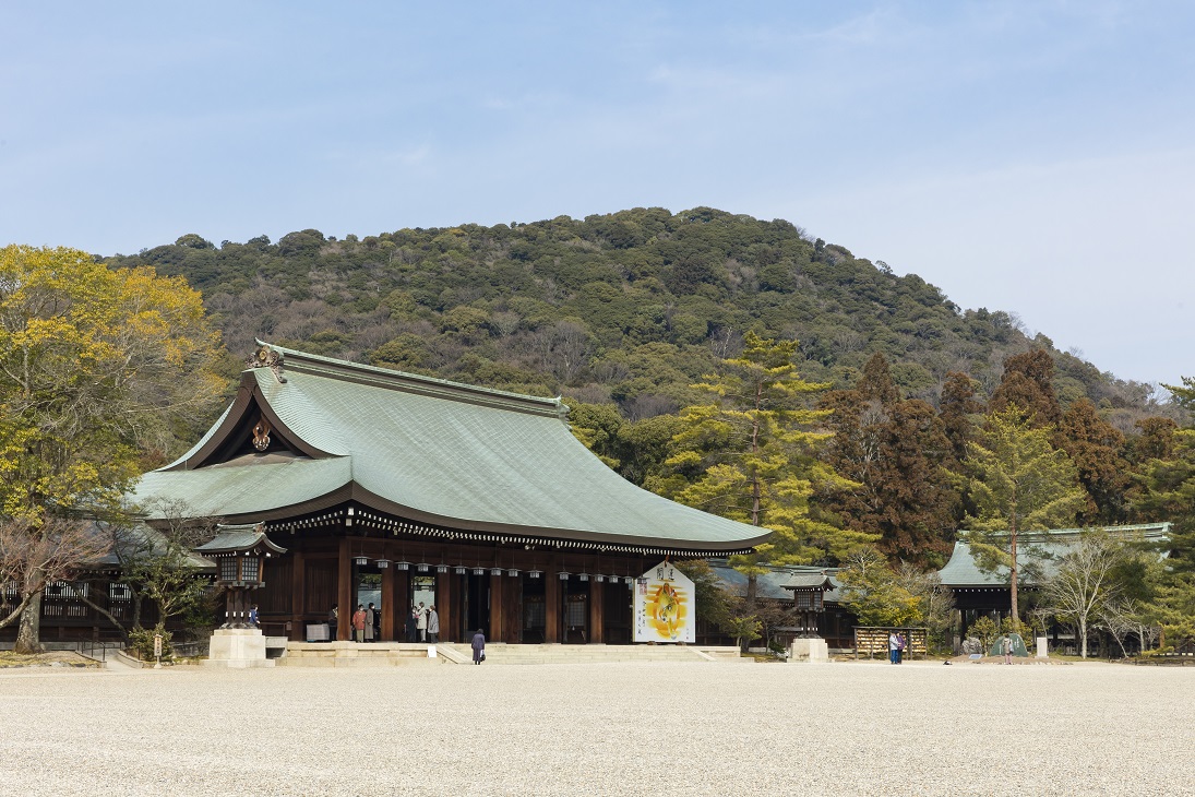 大和三山のひとつである「畝傍山」の麓にあり、甲子園球場約13個分とも言われる広大な敷地内には重厚で美しい社殿をはじめ、畝傍山や深田池周辺の四季折々の風景、毎年話題の大絵馬など、時間をかけてゆっくりめぐりたい見どころがたくさんあります。