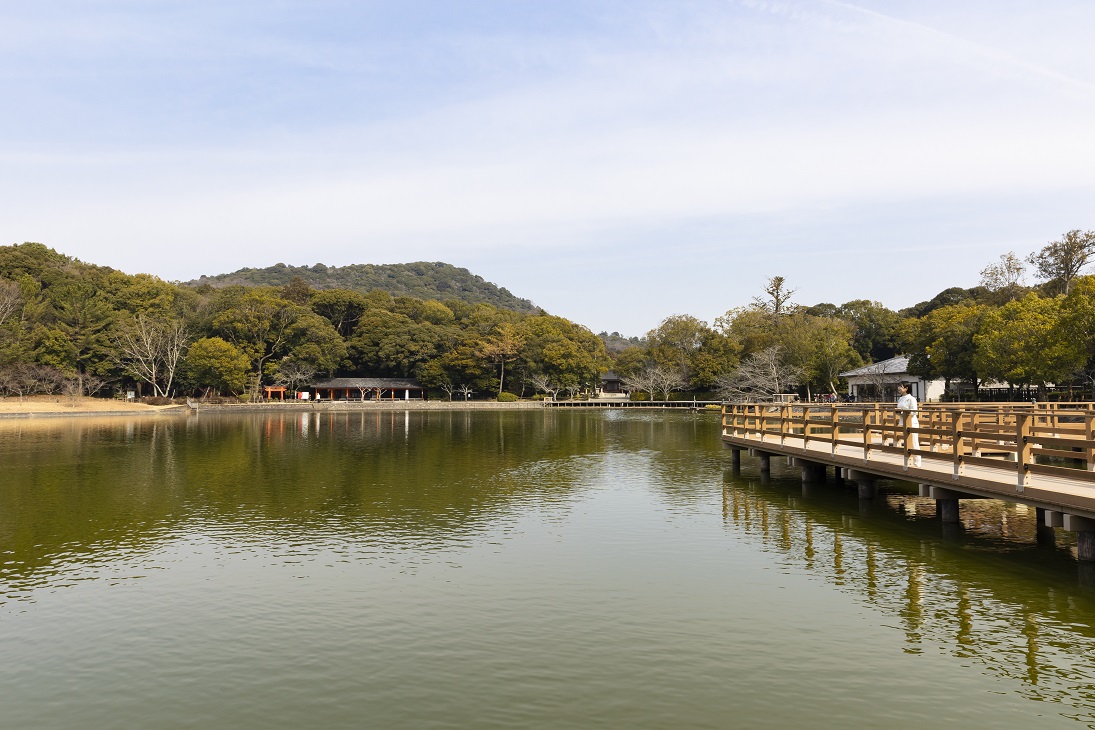 南神門広場の南方にあり、面積は約1万5000坪と広大。季節ごとに異なる表情を見せる池には、遊歩道が整備されており、豊かな自然にふれながらゆっくり散策することができます。