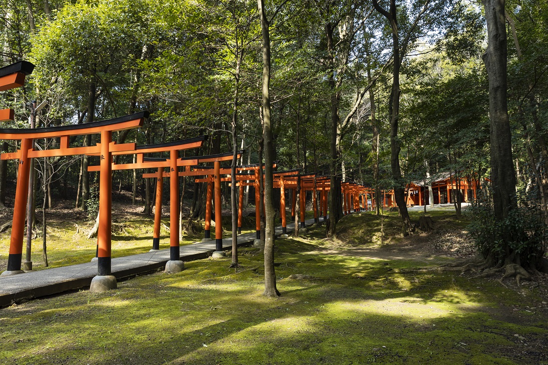 連なる朱色の鳥居をくぐると、御社殿が見えてきます。御祭神は宇迦能御魂神、豊宇気神、大宮能売神。開運厄除、五穀豊穣、商売繁盛のご利益があると言われています。