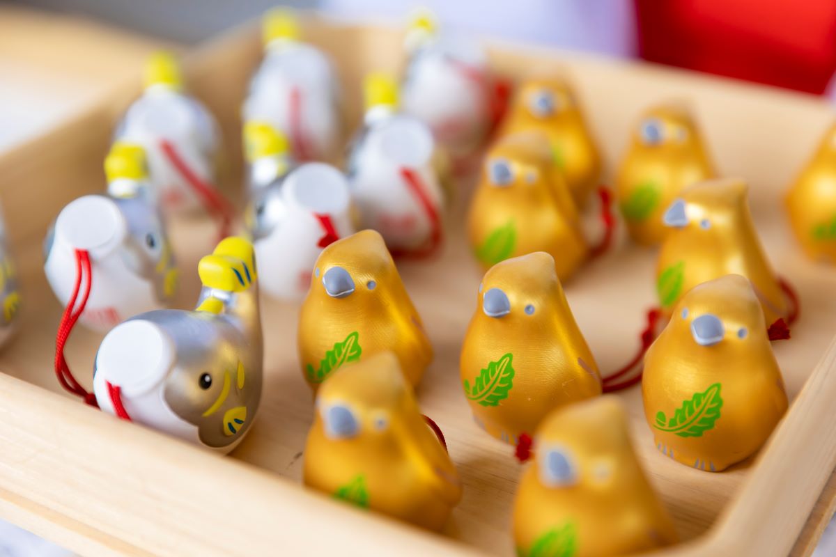 神武天皇にゆかりの深い魚で、戦いの行方を占ったとされる伝承に由来。こちらは大きな口からおみくじを取り出します。形もかわいく、艶やかに光る銀色のボディも印象的。金鵄みくじと一緒に大切に受けたくなる授与品です。