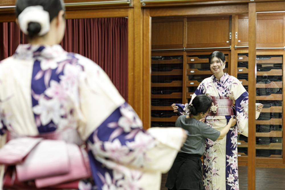 さっそく浴衣選びをスタート。30着以上あるラインナップから好みの柄や帯を選んだら、プロのスタッフさんがしっかり着付けをしてくれます。「どんな柄を選んだらいいのかわからない……」という人は、気軽にスタッフさんに相談を。自分の雰囲気に合う浴衣を提案してくれますよ。