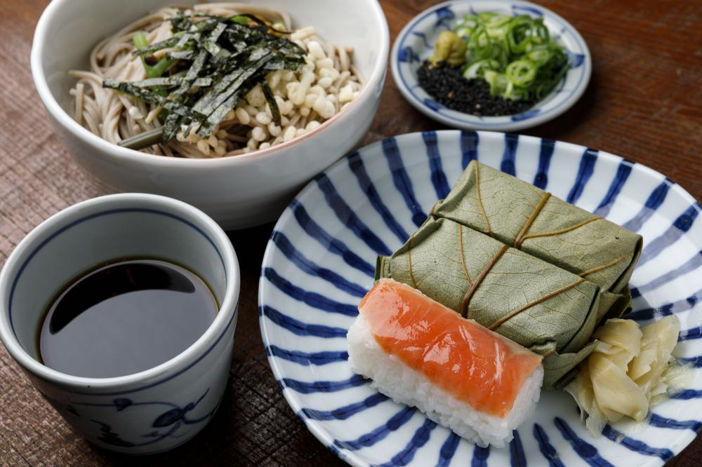 ランチのイチオシは「本日の町家膳(単品970円/ドリンク付き1100円)」。奈良名物 柿の葉寿司に加え、きつねそば、山菜そば、冷そばの中から好きなものを1つ選べるお得なセットとなっています。