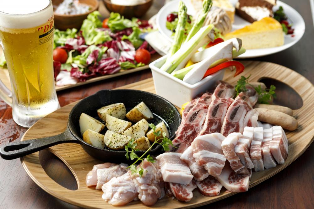 メインのバーベキューは、豚・鶏・牛と焼き野菜がたっぷり。バラエティコースを選べば、さらに唐揚げやカレースパ、焼きそばなどのできたて料理が料理が食べ放題に。