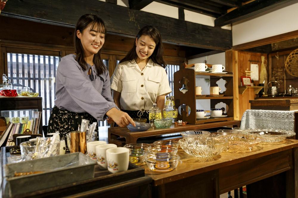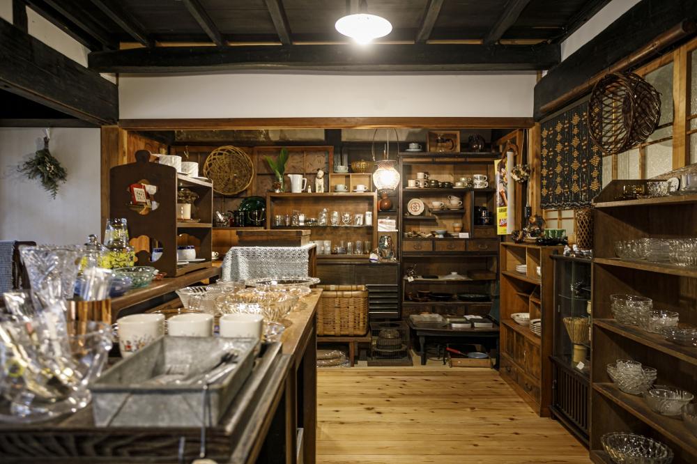 どこか懐かしく、ホッと落ち着く店内には、古道具好きな店主が集めた選りすぐりの食器や雑貨が目白押し。店内では喫茶も営業(不定休)。無農薬米粉を使ったおやつや手づくりアイスが好評で、一息つきたいときにピッタリなお店です。