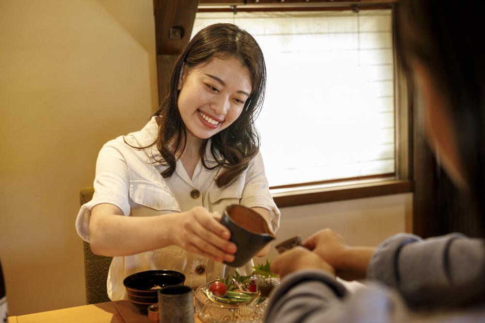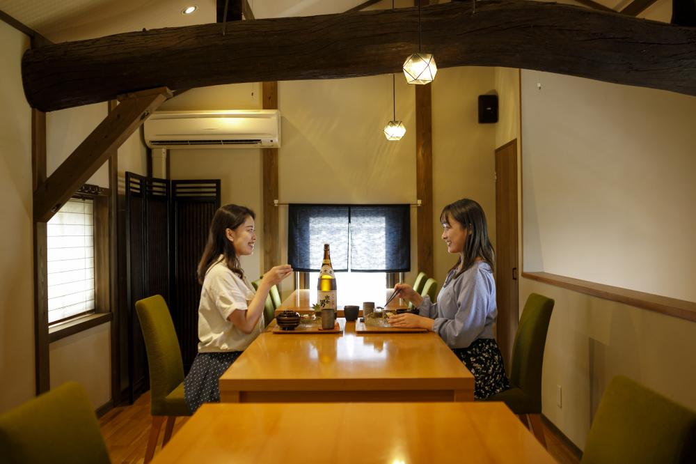 築300年の蔵を改装した店内は、大きな梁が印象的。メニューは昼も夜もおまかせコースのみで、どの料理も素材の味を活かし、出来立てを提供しています。繊細な盛り付けや器にも注目を。地酒も充実しています。