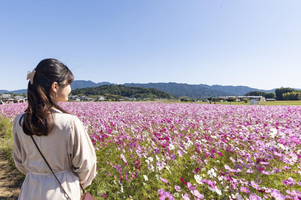 昼間のコスモス畑も映えますが、朝陽が注がれる早朝やロマンチックな雰囲気に包まれる夕陽の時間は、より美しい光景に。一期一会の景色をお楽しみください。
