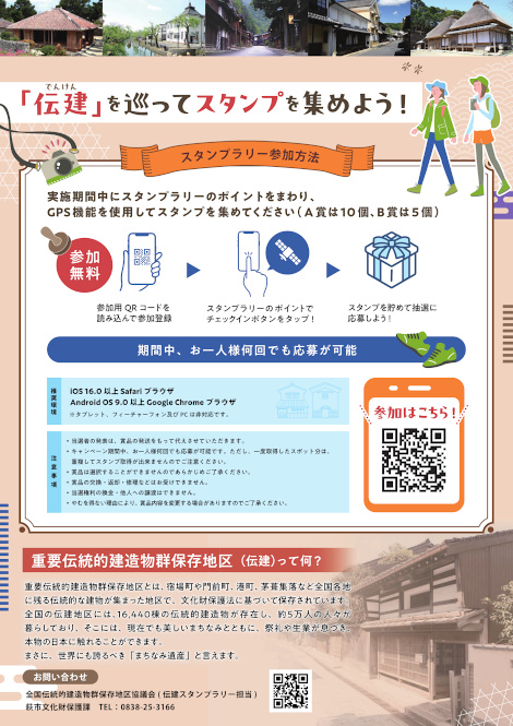 - 内容・参加方法 実施期間中に、全国129カ所の伝建地区を廻ると、デジタルスタンプを獲得できます(要スマートフォン)。スタンプを5個以上獲得したら、応募のチャンス。伝建地区を持つ市町村の名産品が当たる抽選に応募ができます。
